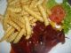 dazu Preiselbeeren, Pommes frites und kleinen bunten Salatteller